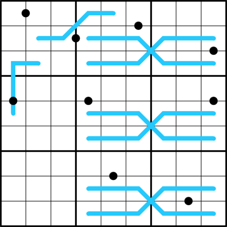 • Region Sum Lines: Digits on a blue line have the same sum within each 3x3 box the line passes through. Different lines may have different sums.