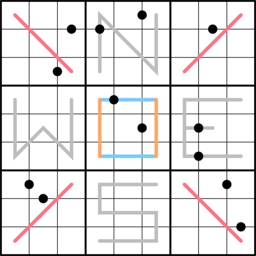 Normal Sudoku rules apply. Gray lines North (N), South (S), East (E), and West (W) contain one each RENBAN LINE (consecutive, but in any order), GERMAN WHISPER LINE (all numbers are at least 5 apart from their neighbors on the line), DUTCH WHISPER LINE (all numbers are at least 4 apart from their neighbors on the line) and CONSECUTIVE LINE (all numbers are consecutive with their neighbors on the line). The solver must determine which gray line is which type. Numbers on each of the four straight lines in box 5 sum to 17. Red lines are also Dutch Whispers lines. KROPKI PAIRS- Numbers with a black dot between them are in a ratio of 2:1. Not all possible dots are given.