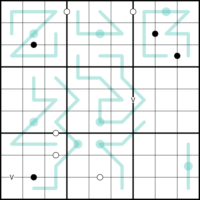 This is the first puzzle in the Zippular Lines series. This puzzle introduces Zippular Lines along with the common constraints of Kropki Pairs and XV Pairs. These puzzles make use of modular math: the remainder of the sum of two numbers is the same as the sum of the individual remainders of the two numbers.