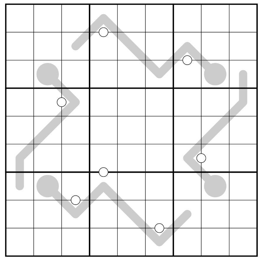 Cells separated by a white dot contain consecutive digits. Not all dots are given. (Partial Kropki)