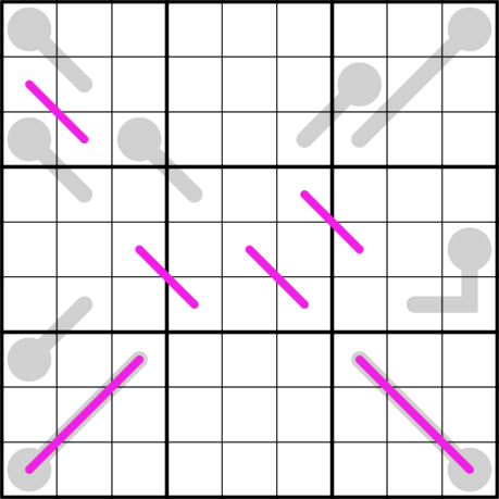 - Renban Linien: Die Ziffern entlang der rosafarbenen Linien sind ein fortlaufender Satz ohne Wiederholungen.