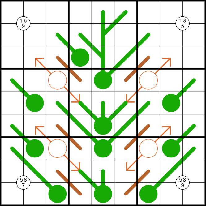 • Numbers in circled corners must be present as values in the four connected cells