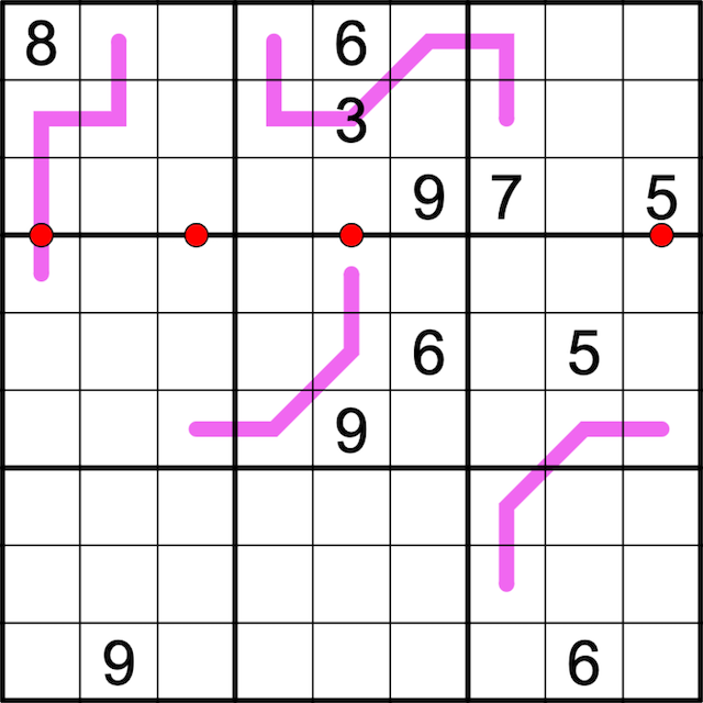 • Non-consecutive: digits in cells separated by red dots must be non-consecutive. Cells separated by red dots must have opposite shading.