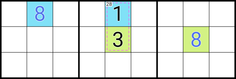 - In the example image, there must be two 8’s in the cells indexed by the 28 cage in box 2.