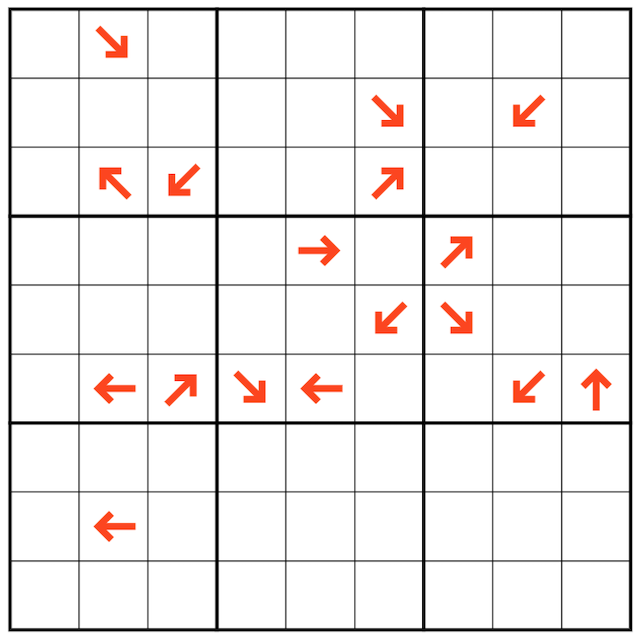 Normal sudoku rules apply. Hot Arrows: The digit in a hot arrow cell must be bigger than the digits in all the cells that it points to.