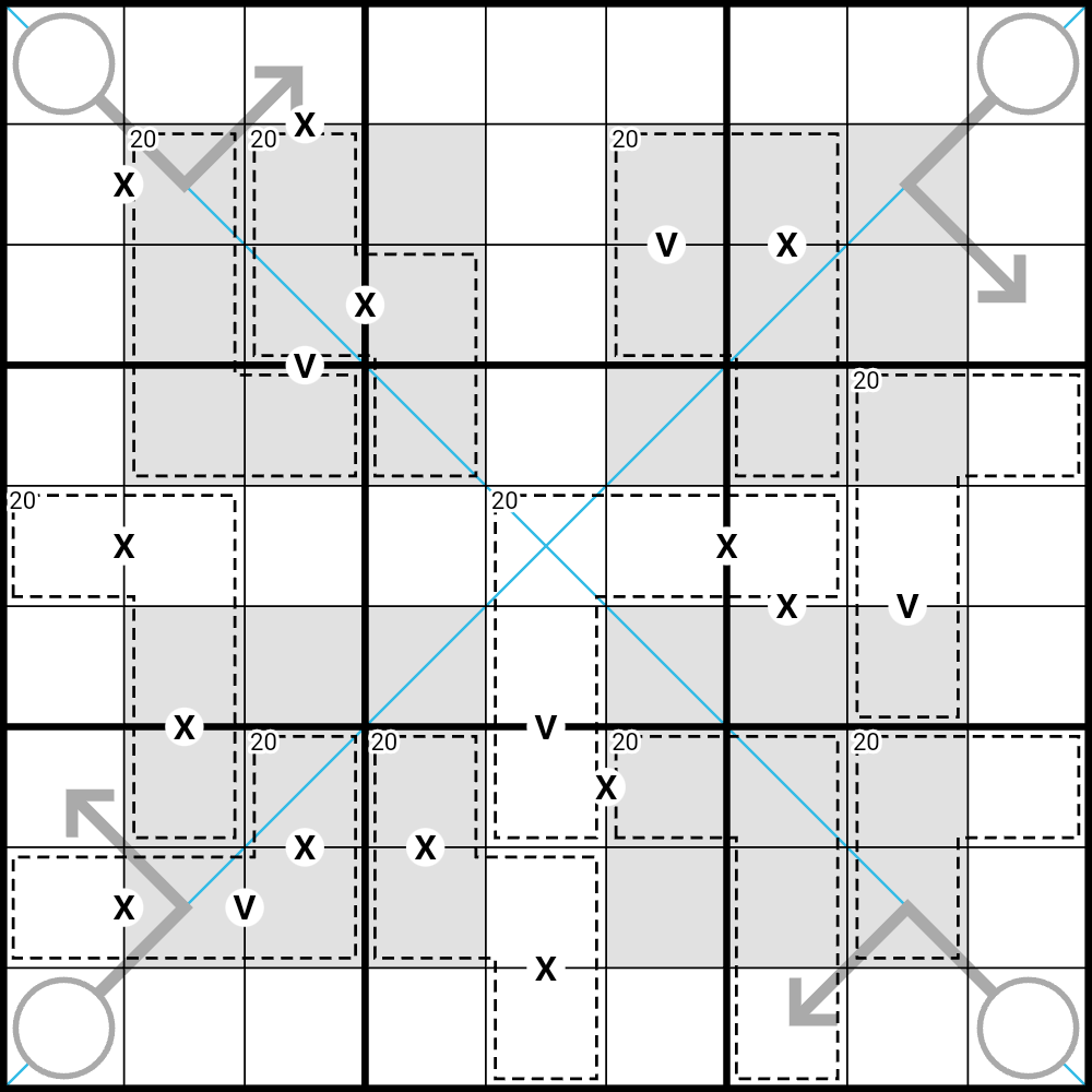 - XV-pairs: Cells joined by an X or V must sum to 10(X) or 5(V).