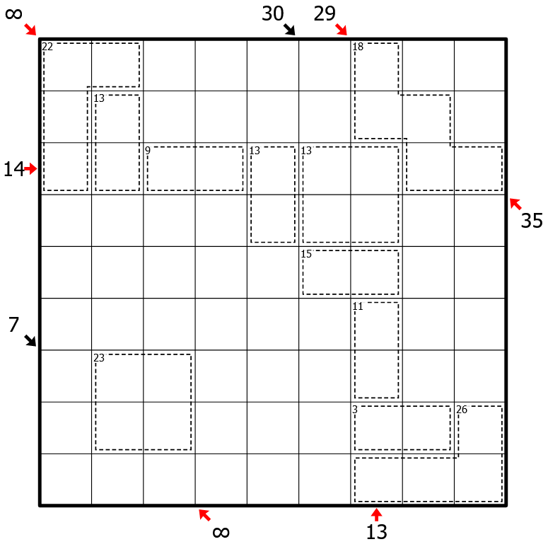 This puzzle uses a constraint that heliopolix created involving black and white holes and teleporting little killer clues, which I found fascinating. I decided to add a slight twist of my own in this puzzle, but I encourage you to check out some of the originals. The puzzle Tachyons and Black Holes includes a 6x6 example with a solution in case you want to visualize how the rules work.
