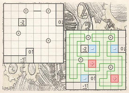 • Gears visited by the loop must alternate inside and outside (or vice versa). A gear is considered visited when the loop travels from a cell not touching that gear to a cell touching that gear and no other gears, either directly or through a cell touching multiple gears.