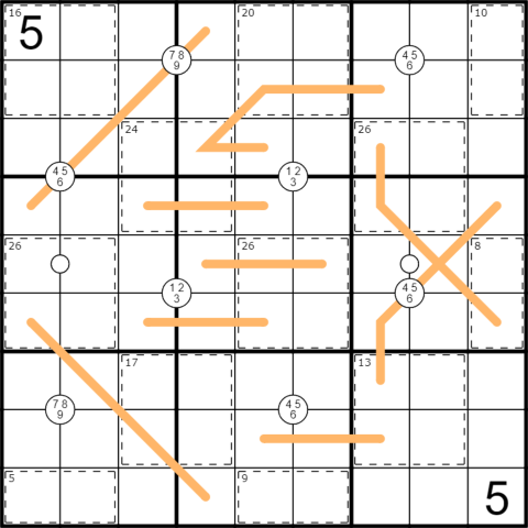 Killer: Ziffern in Käfigen summieren zur kleinen Zahl im Eck und dürfen sich nicht wiederholen.