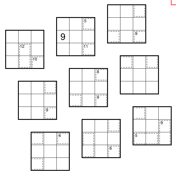 • This is a normal 9x9 Sudoku grid that has been separated into 3x3 boxes, shown in an arbitrary order. When correctly assembled the normal sudoku rules apply.