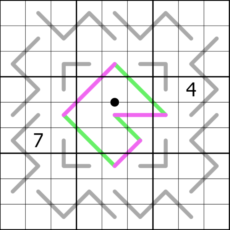 Kropki-Punkte: Ziffern in Zellen, die durch einen schwarzen Punkt verbunden sind, haben ein Verhältnis von 1:2
