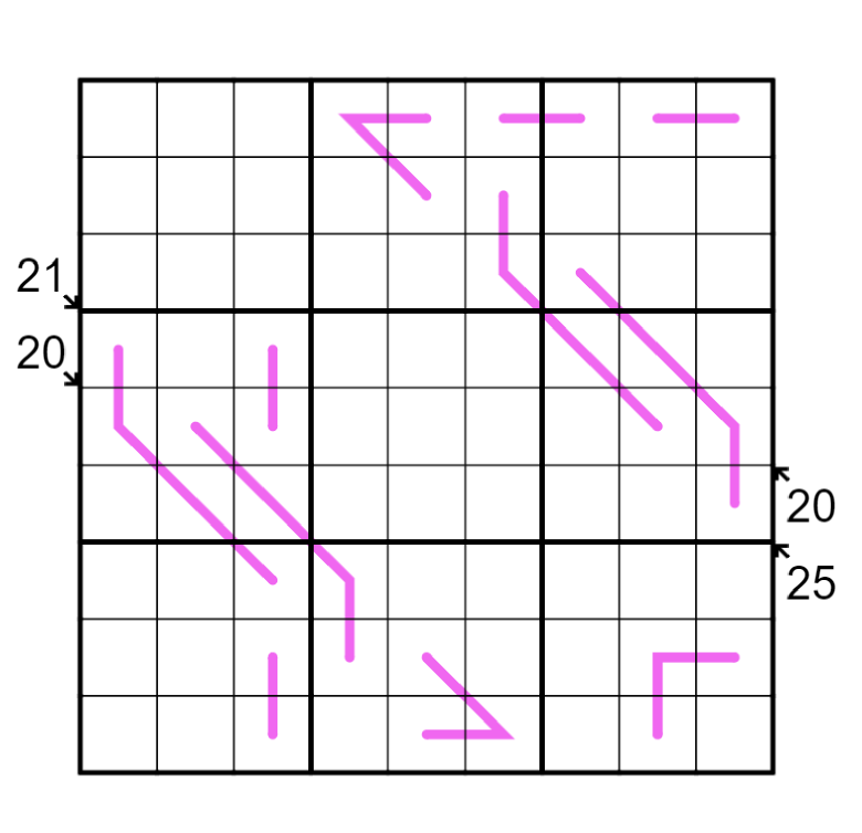Each row, column, and 3x3 region must contain the digits 1 through 9. Digits on a purple line form a set of consecutive, non-repeating digits in any order. Clues outside the grid give the sum of all digits on the indicated diagonal.