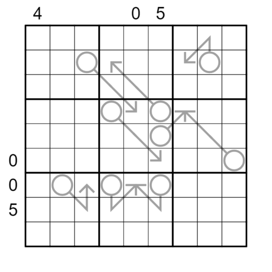 - Zeigerpfeile: Die Ziffern entlang der Pfeile ergeben in der Summe den Wert im verbundenen Kreis. Darüber hinaus zeigen die Pfeilspitzen auf eine Zelle, die die Ziffer innerhalb des Pfeilkreises enthält. Der Wert in der Pfeilspitze gibt den Abstand von der Pfeilspitze zu dieser Zelle an. Möglicherweise befinden sich zwischen dieser Zelle und der Pfeilspitze weitere Vorkommen derselben Ziffer.