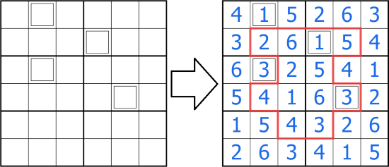 Lösungscode: Column 4 with hyphens between digits separated by the loop. (for example, column 4 with hyphens from the 6x6 example puzzle would be 2-1563-4)