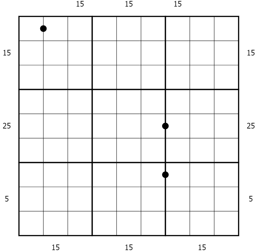 - Kropki: Digits separated by a black dot must be in a 1:2 ratio. Not all black dots are necessarily given.