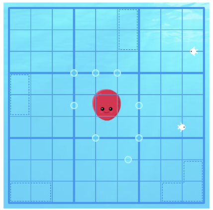 • Find and draw Stu the octopus's eight tentacles; these are snaking lines emanating from his body (in the central cell) and moving orthogonally or diagonally between the centres of cells. Each one ends somewhere in the perimeter of the grid.
