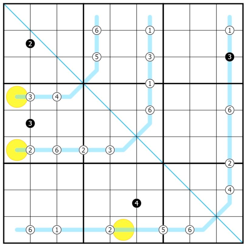 - Region Sum Lines: Thick box borders divide blue lines into segments with equal sums.
