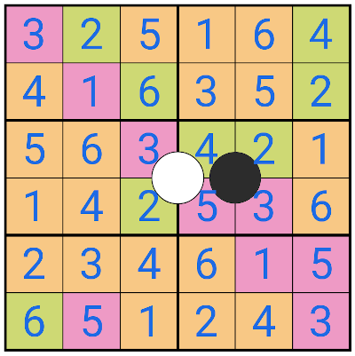 Here's an example of what a 6x6 solution might look like, to explain the go-stone rules. The relevant cells have been coloured to indicate parity.