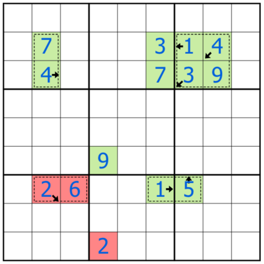 Relocages: If a digit in a cage is placed on a small black arrow, then one of the other digits in the same cage must be pointed at by the arrow and be a distance away equal to the digit placed on the black arrow.