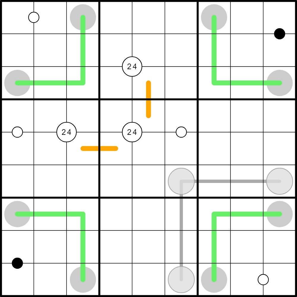 - Digits on a grey 'between' line must have values between the digits on the circled ends of the line.