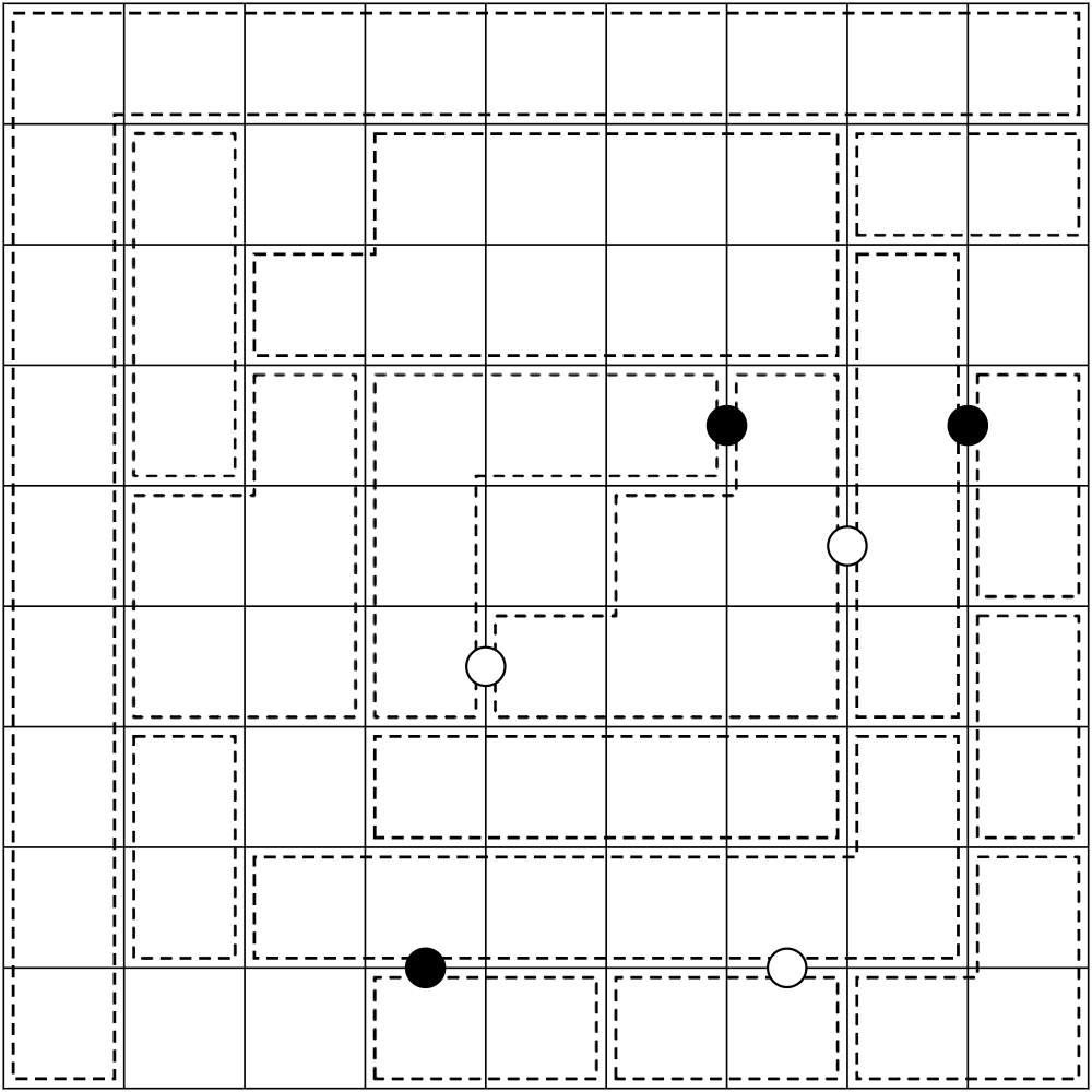Kropki: Cells separated by a white dot are consecutive and cells separated by a black dot are in a 1 to 2 ratio.