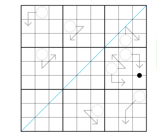 Three of the regions are magic squares. In these regions, all rows, columns, and diagonals sum to the same number.