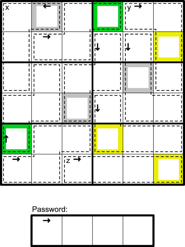 • If a cell is marked yellow, then that digit is in the password but must be in a different location.