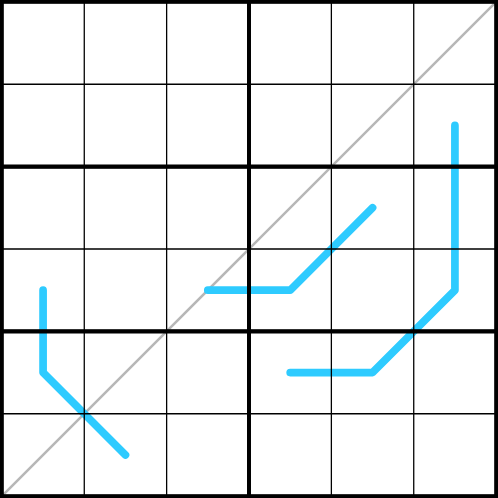 Place a digit from 1-6 in each cell such that digits do not repeat in any row, column, outlined box, or along the grey diagonal.