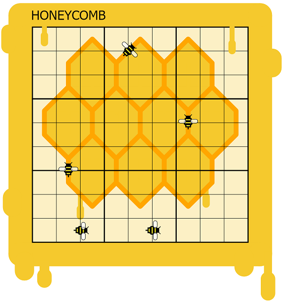Bumblebees: Digits separated by a yellow and black bumblebee have a ratio of 1:2. If the bee is on a cell vertex then it only counts for the two cells on the honey comb line. Not all bees are necessarily given.
