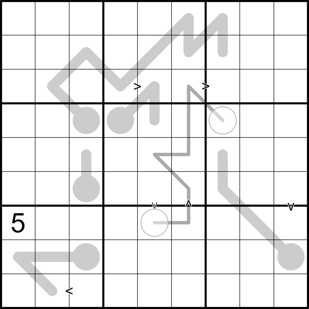 3. In between line - digits on the line connected by the two circles must have values between the values on the two circles
