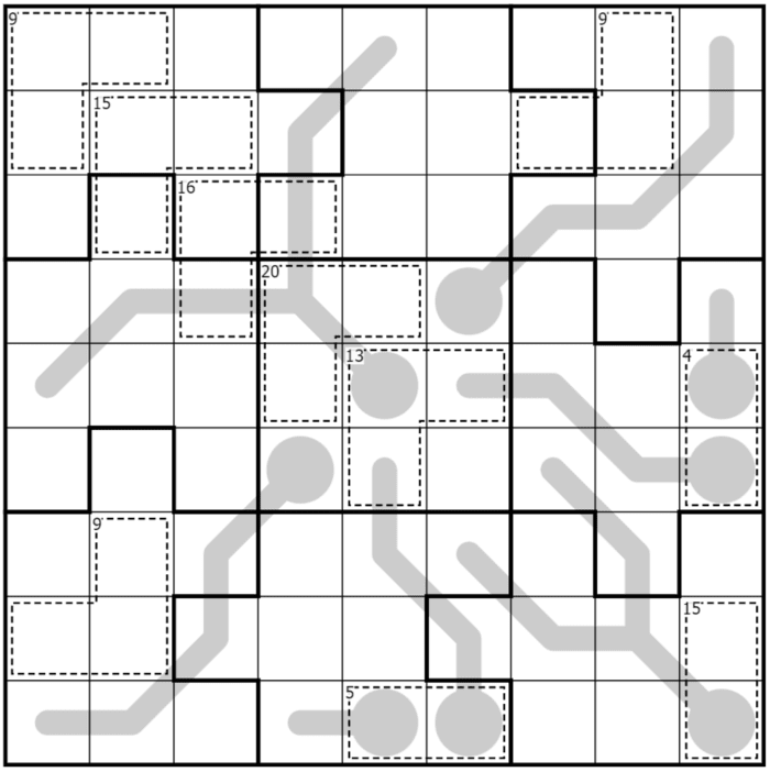 - Freiform: Jede Reihe, Spalte und jeder durch die dicken Linien abgetrennter Bereich muss die Zahlen 1-9 enthalten.