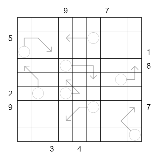 Numbered Rooms: Clues outside the grid indicate the digit which has to be placed in the Nth cell in the corresponding direction, where N is the digit placed in the first cell in that direction.