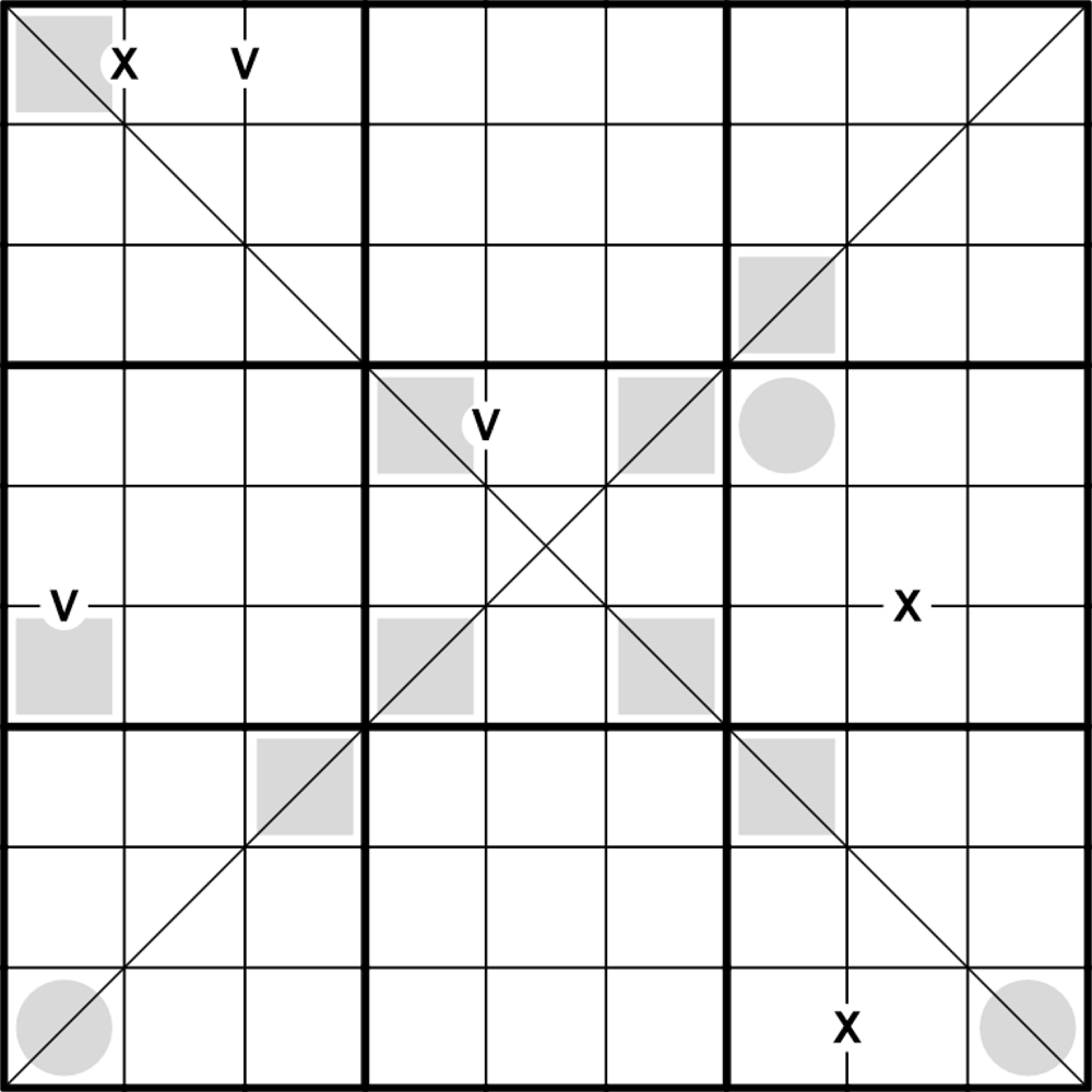 Diagonal: Ziffren könnte nicht zweimal an die diagonal angeschreben wurden. (Markiert durch die Linien)