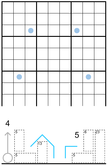 4. Draw 2 snakes which must each begin and end at a different blue spot. Snakes are lines which may move orthogonally and diagonally between cells. They may touch and/or cross each other (or themselves), but they must not branch, share cells, or enter other clues (including given digits).