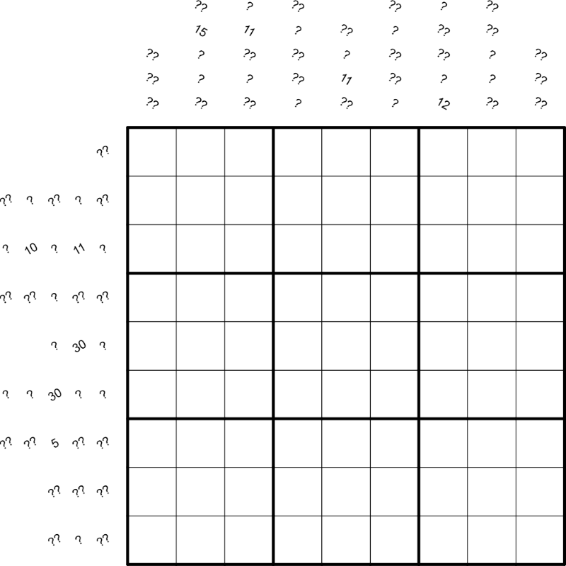 A ? represents a digit 0-9. One ? indicates a single-digit number, and a region corresponding to one ? contains only one cell. Two ?s indicate a two-digit number that cannot start with 0.