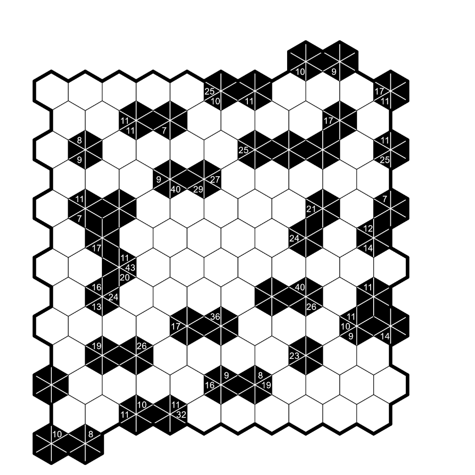Es gelten die normalen (sechseckigen) Kakuro-Regeln: Platzieren Sie in jeder leeren Zelle eine Ziffer von 1 bis 9, sodass sich die Ziffern nicht in einer geraden Linie wiederholen und keine schwarzen Zellen sie trennen. Eine Zahl in einer schwarzen Zelle gibt die Summe der Ziffern an, die der Hinweis in seiner angegebenen Richtung sieht (bis zur nächsten schwarzen Zelle oder dem Rand des Gitters).