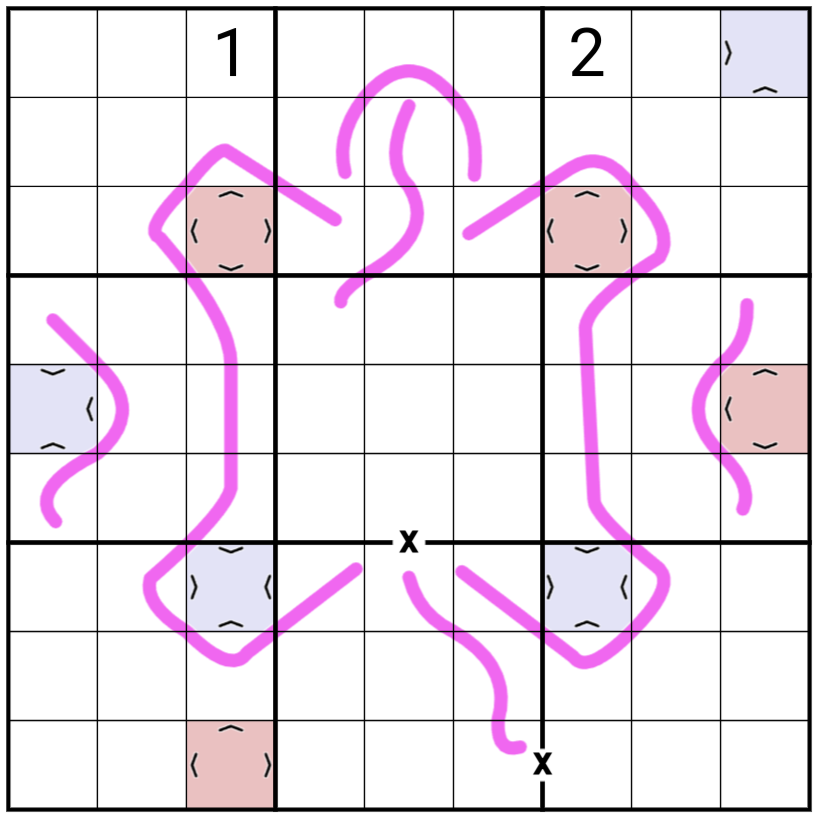 - Fortress: Digits in red Maximum-cells are bigger than the up to 4 orthogonally adjacent digits. Digits in blue Minimum-cells are smaller than the up to 4 orthogonally adjacent digits.