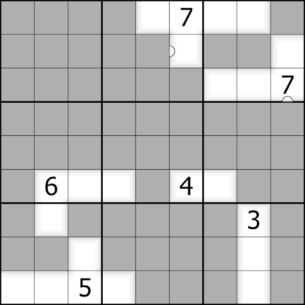Some buildings are connected by stairs, marked with a white dot. These connected buildings must contain consecutive digits. Note: Not all possible white dots are given.