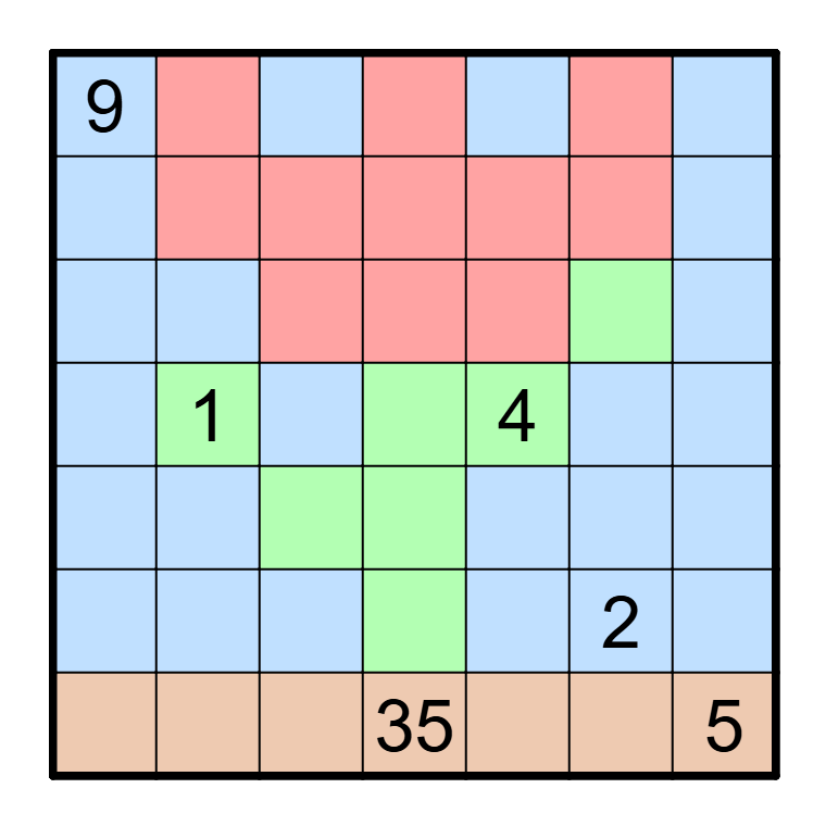If a number clue appears within a region, it denotes the product of the sizes of each color group within that region. Separate instances of the same color within a region count as new groups. Not all regions need to contain a number.