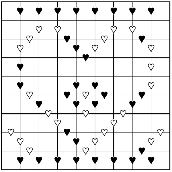 Regrettably, LMD doesn't seem to like the less than symbol in the puzzle description, so I had to change the <3 in the heart descriptions to "less than 3".