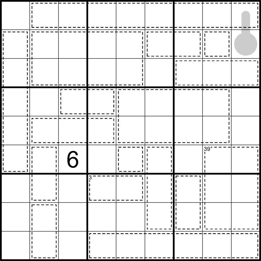 The sum of all digits in any cage is either 3, 9, 33, or 39; two of the sums are given on the top-left of the cage. Digits cannot repeat in a cage.