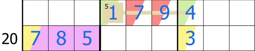 This image shows the valid Hit Point from the example included in the wording above, and a valid Y-Sum fill, where 7 points to 3, meaning the sum is the first 3 cells (7 + 8 + 5 = 20). Hope this helps.