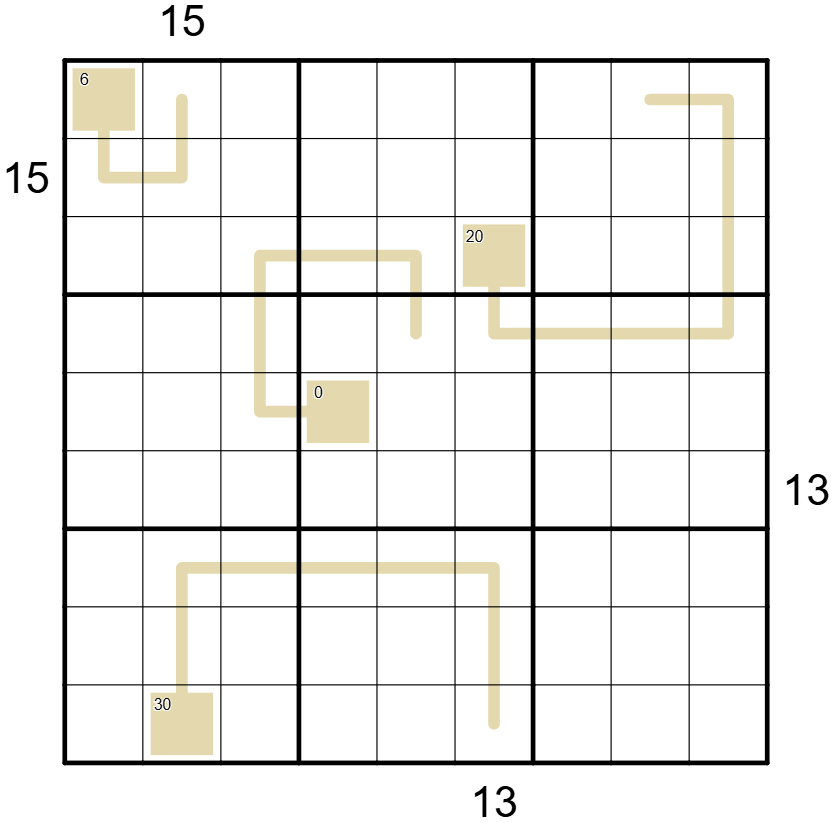 Clues outside the grid indicate the sum of the first Y digits in the corresponding direction. Y is the digit placed in the Xth cell in the corresponding direction, where X is the digit placed in the first cell in that direction.
