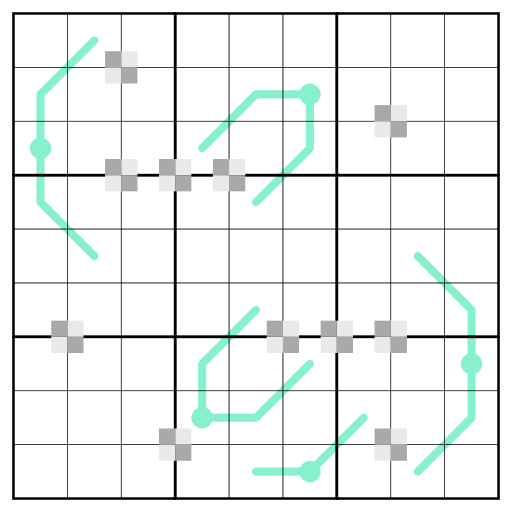 - Normal sudoku rules apply, i.e. each row, column, and 3x3 region has to contain the digits from 1 to 9 once each.