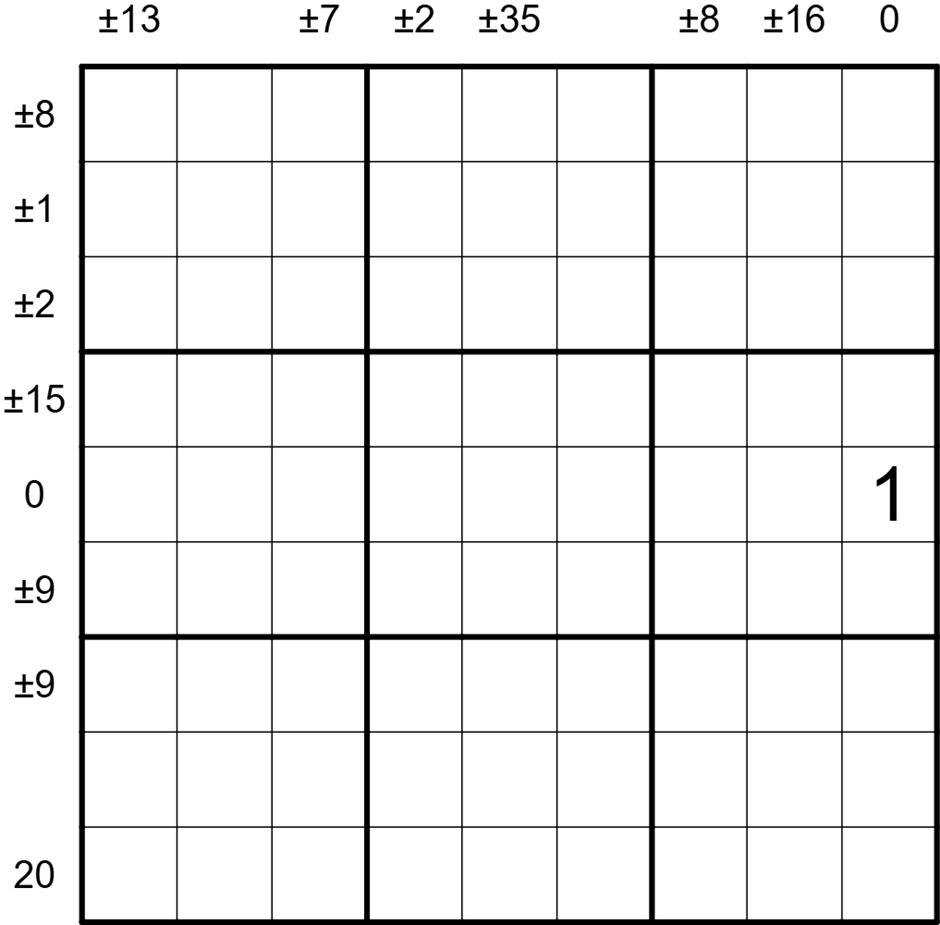Clues outside the grid give the sum of the values of each cell between the 1 and the 9 in that row or column. If the 1 or 9 is a negator the whole sum is multiplied by -1. A ± symbol indicates that the sum may be either a positive or a negative number. Solve in Sudokupad