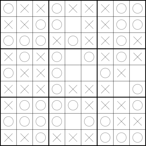 A valid game of meta tic-tac-toe was played on the Sudoku grid, until the position indicated by the Xs and Os was reached.