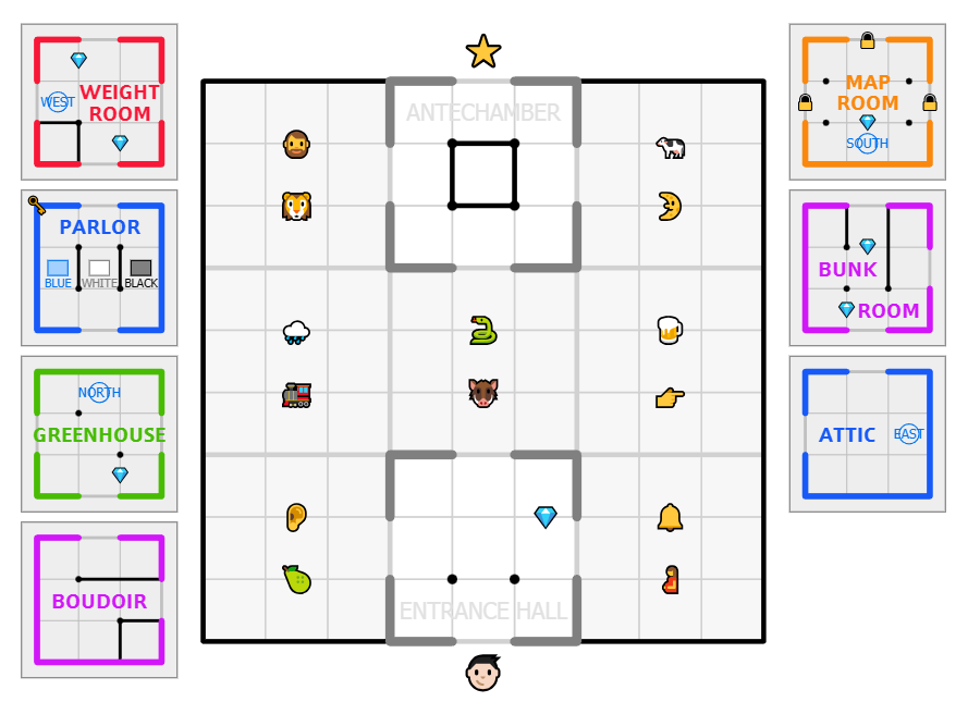 Build the mansion by placing all nine rooms into the grid, one into each box; two rooms have been placed already and may not be moved. Rooms may not be rotated. A doorway of a room may abut the exterior wall of the mansion or the perimeter wall of another room, but movement between rooms may only occur where both rooms have matching doorways. Each room has its own specific rule that applies only within that room: