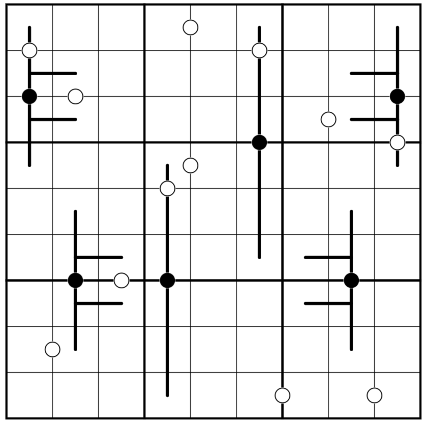White Kropki – Standard white dots: the two digits between a white dot are consecutive. Not all white dots are given.