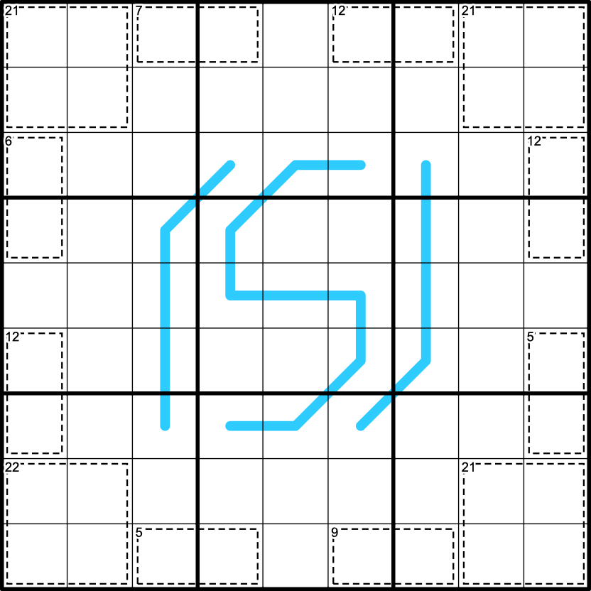 Along a line, each blue line segment within a different 3x3 box must sum to the same total. The sum may be different for different lines.