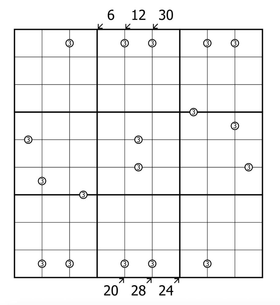 Little Killer: Numbers outside the grid are the sum of the digits pointed to along the indicated diagonal. Digits are allowed to repeat along those diagonals as normally allowed by the other rules.